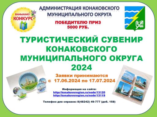 Во исполнение Постановления Администрации Конаковского муниципального округа Тверской области №530 от 13.06.2024 «О проведении конкурса по разработке сувенирной продукции «Туристический сувенир Конаковского муниципального округа», Администрация Конаковского муниципального округа Тверской области объявляет о начале приема заявок для участия в конкурсном отборе.