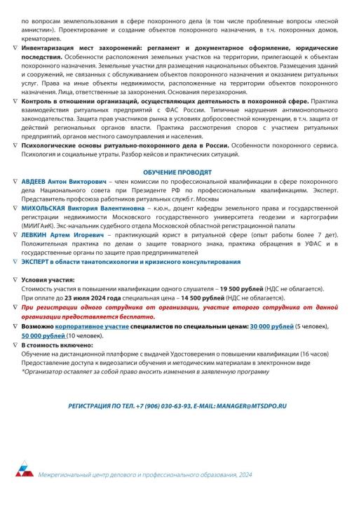 В целях информирования организаций, осуществляющих ритуальнуюдеятельность на территории муниципальных образований Тверской области, Министерство промышленности и торговли Тверской области направляет информацию о проведении межрегиональным центром делового и профессионального образования курса повышения квалификации по теме: «Реформирование похоронно-мемориальной деятельности России в условиях глобальных экономических и политических трансформаций: анализ острых проблем, выплата пособий и регламент инвентаризации мест захоронений», который будет проходить 5-6 сентября 2024 года.
