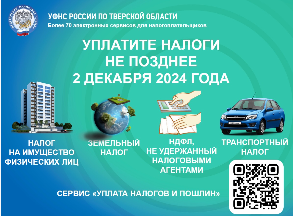 Управление федеральной налоговой службы России по Тверской области, в рамках проведения ежегодной налоговой кампании, уведомляет о соблюдении уплаты физическими лицами имущественных налогов в срок до 2 декабря 2024 года.